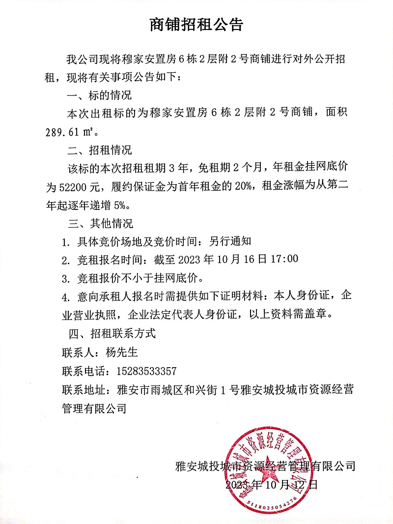 穆家安置房6棟2層附2號(hào)商鋪招租公告