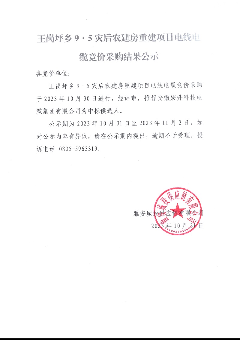 王崗坪鄉(xiāng)9.5災(zāi)后農(nóng)建房重建項(xiàng)目電線電纜競(jìng)價(jià)采購(gòu)結(jié)果公示