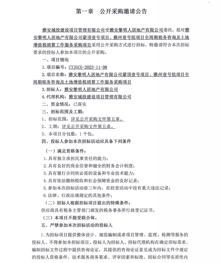 雅安黎明人居地產(chǎn)有限公司蒙頂壹號(hào)項(xiàng)目、雅州壹號(hào)院項(xiàng)目全周期稅務(wù)咨詢及土地增值稅清算工作服務(wù)采購項(xiàng)目公開采購邀請公告