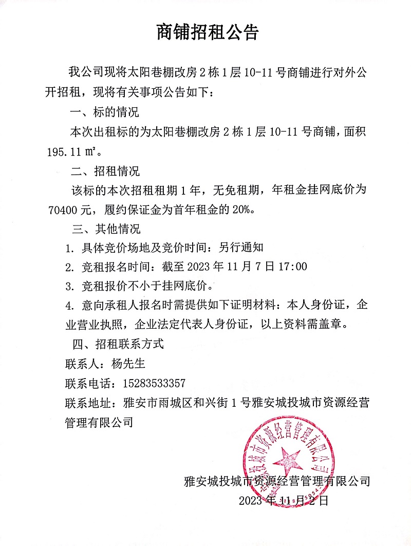 太陽巷棚改房2棟1層10-11號(hào)商鋪招租公告