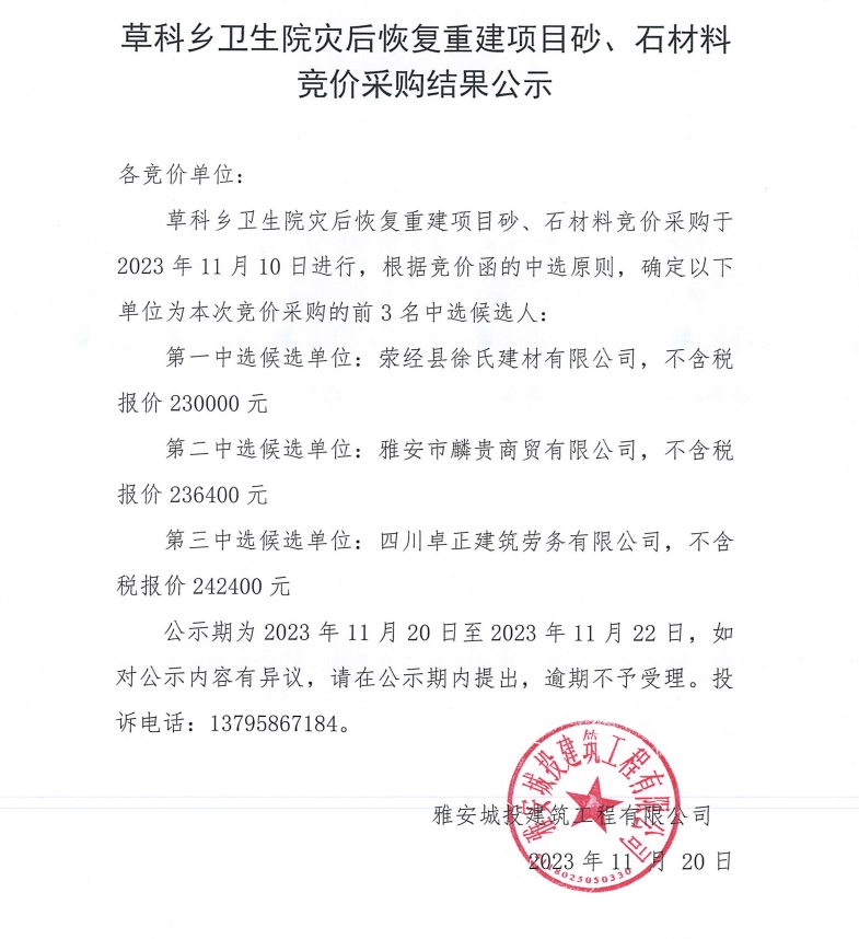 草科鄉(xiāng)衛(wèi)生院災(zāi)后恢復(fù)重建項(xiàng)目砂、石材料競價(jià)采購結(jié)果公示
