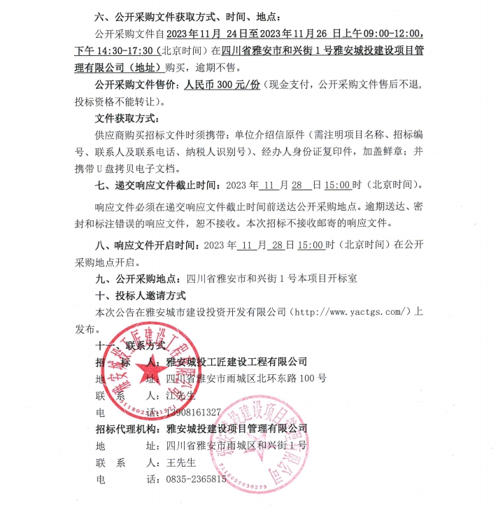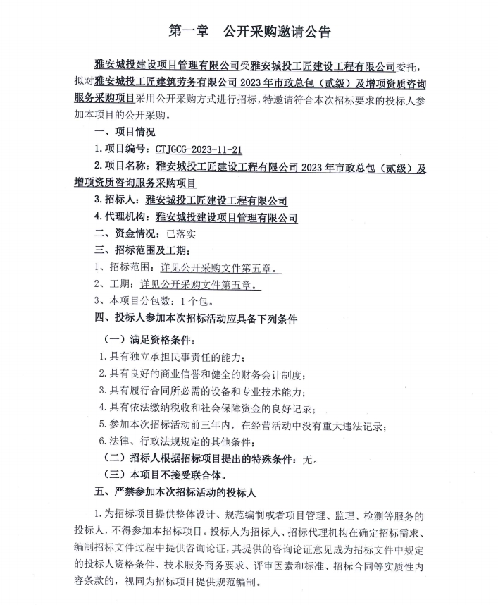 雅安城投工匠建設(shè)工程有限公司2023年市政總包(貳級(jí))及增項(xiàng)資質(zhì)咨詢服務(wù)采購(gòu)項(xiàng)目公開采購(gòu)邀請(qǐng)公告