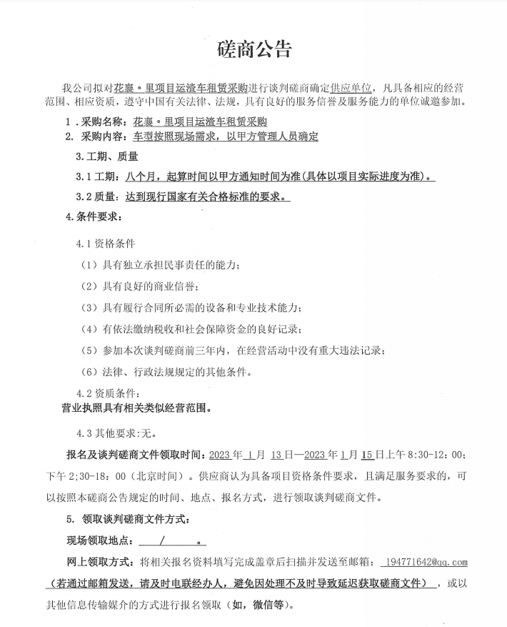 花襄·里項(xiàng)目運(yùn)渣車租賃采購(gòu)談判磋商公告
