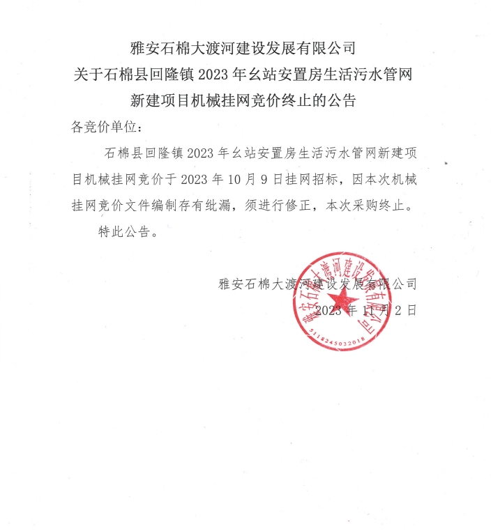 雅安石棉大渡河建設(shè)發(fā)展有限公司關(guān)于石棉縣回隆鎮(zhèn)2023年幺站安置房生活污水管網(wǎng)新建項(xiàng)目機(jī)械掛網(wǎng)競價(jià)終止的公告