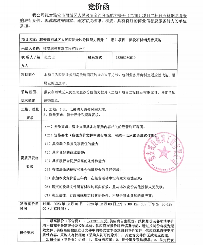 雅安市雨城區(qū)人民醫(yī)院金沙分院能力提升(二期)項(xiàng)目二標(biāo)段石材鋼龍骨采購競(jìng)價(jià)公告