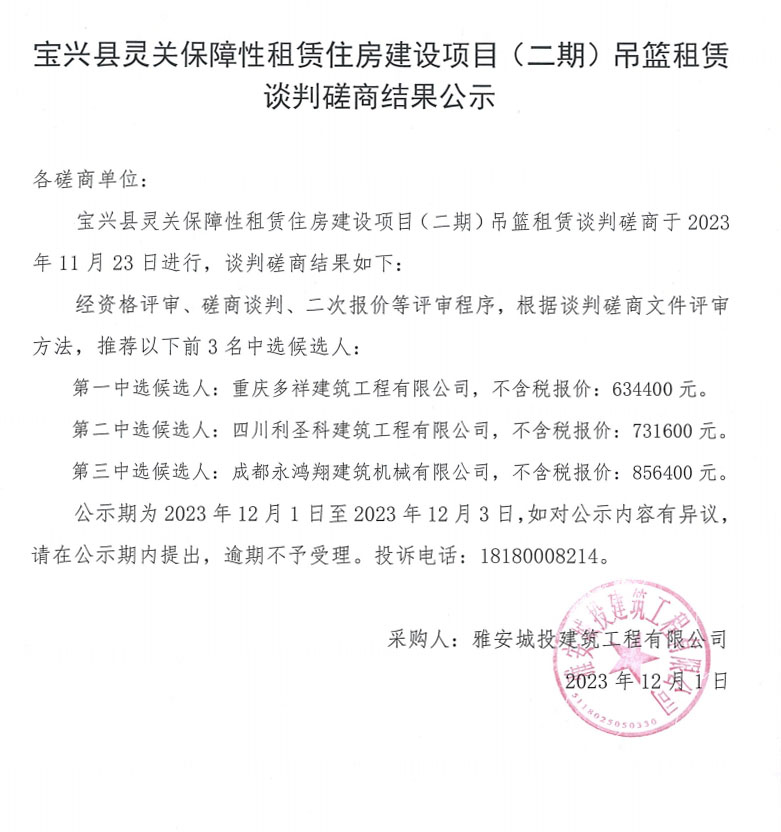 寶興縣靈關保障性租賃住房建設項目(二期)吊籃租賃談判磋商結果公示