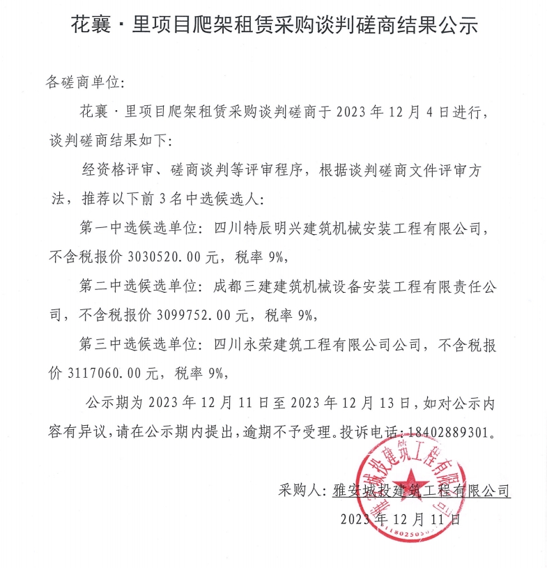 花襄·里項(xiàng)目爬架租賃采購談判磋商結(jié)果公示