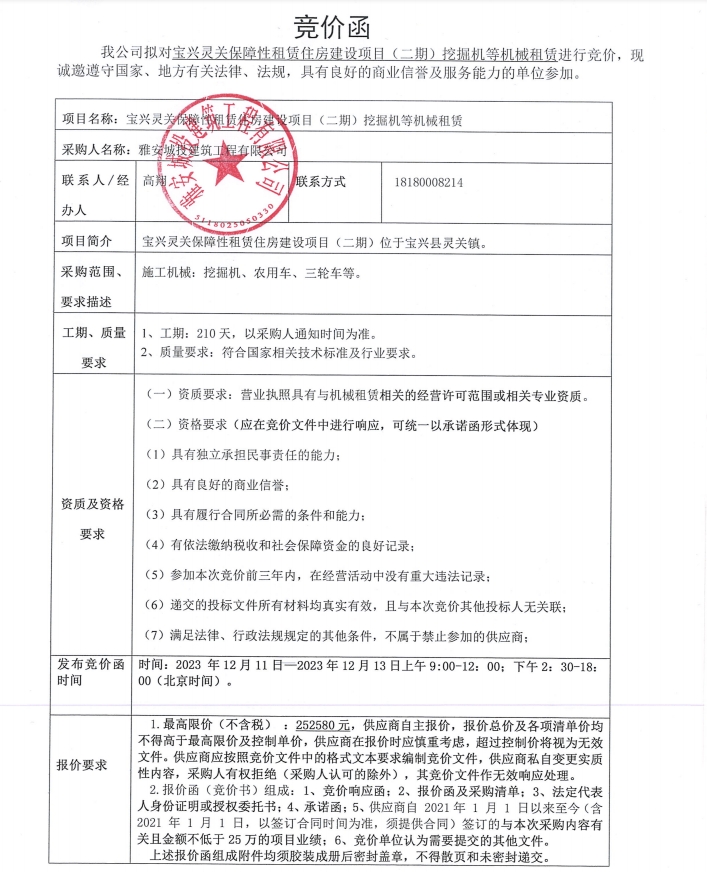 寶興靈關(guān)保障性租賃住房建設(shè)項目(二期)挖掘機(jī)等機(jī)械租賃競價公告