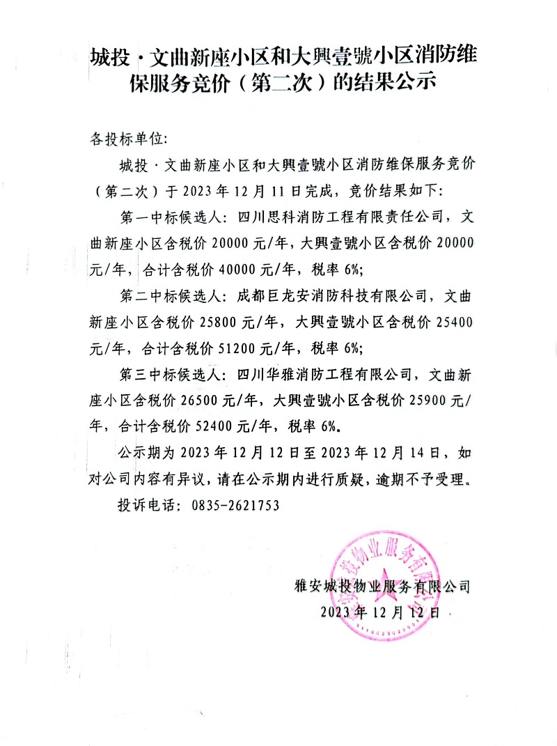 城投·文曲新座小區(qū)和大興壹號小區(qū)消防維保服務競價(第二次)的結果公示
