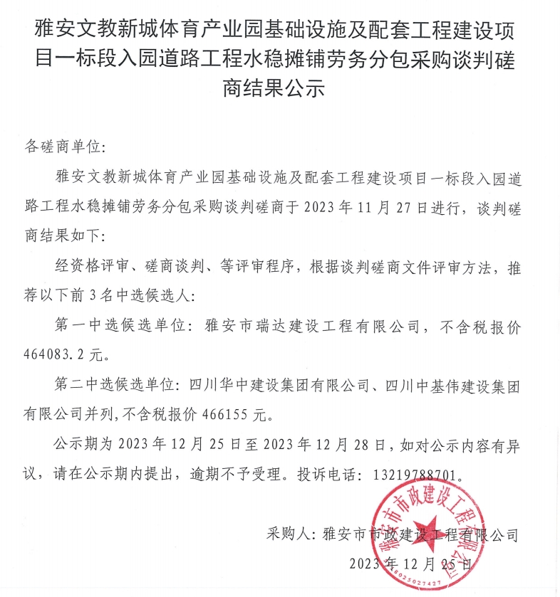 雅安文教新城體育產(chǎn)業(yè)園基礎(chǔ)設(shè)施及配套工程建設(shè)項(xiàng)目一標(biāo)段入園道路工程水穩(wěn)攤鋪勞務(wù)采購(gòu)談判磋商結(jié)果公示
