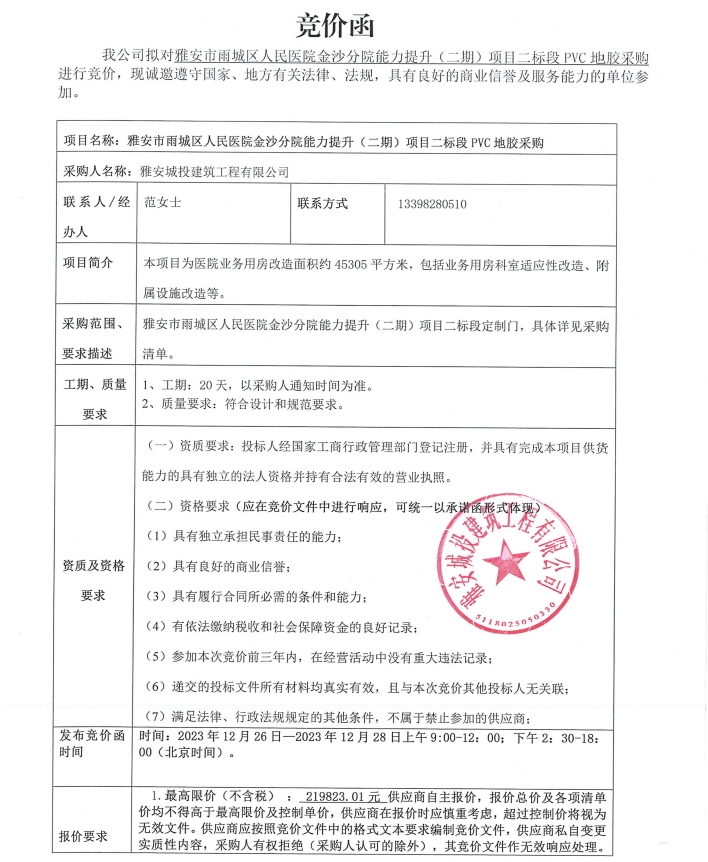 雅安市雨城區(qū)人民醫(yī)院金沙分院能力提升(二期)項(xiàng)目二標(biāo)段PVC地膠采購(gòu)競(jìng)價(jià)公告