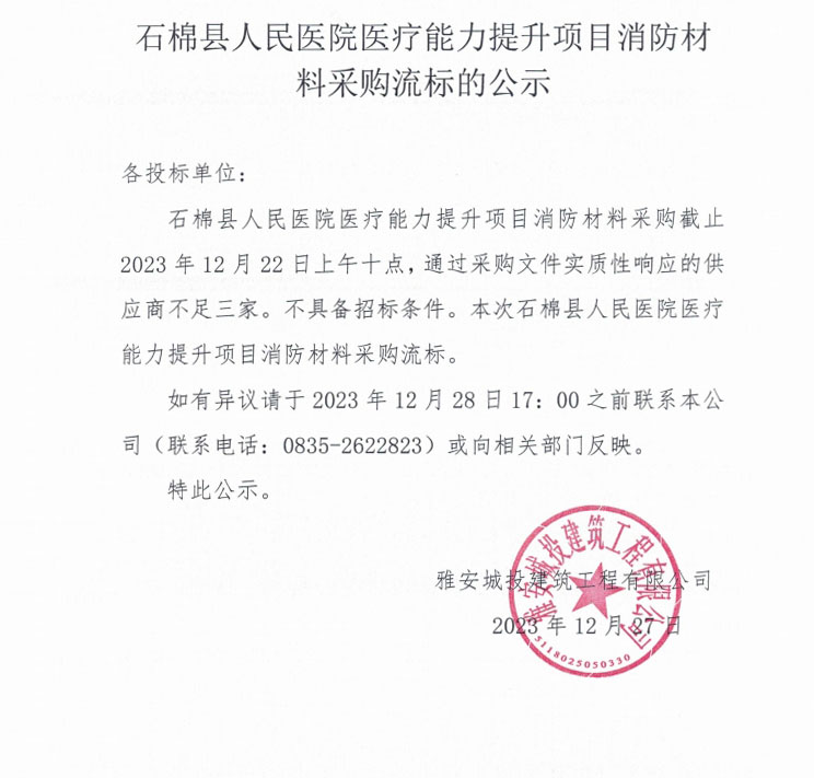 石棉縣人民醫(yī)院醫(yī)療能力提升項目消防材料采購流標(biāo)的公示