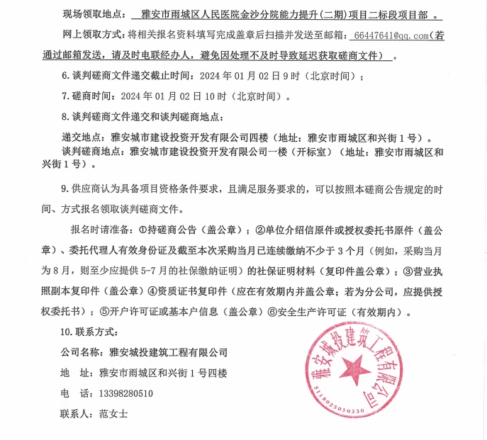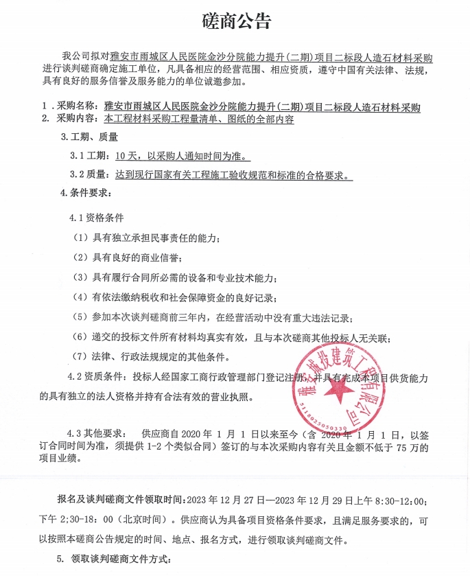 雅安市雨城區(qū)人民醫(yī)院金沙分院能力提升(二期)項(xiàng)目二標(biāo)段人造石材料采購談判磋商公告