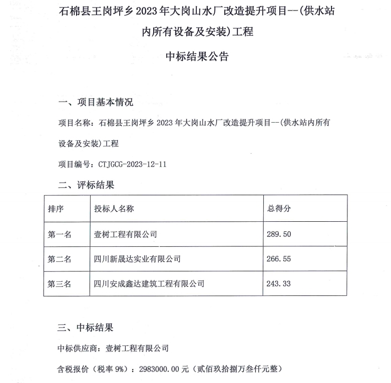 石棉縣王崗坪鄉(xiāng)2023年大崗山水廠改造提升項目--(供水站內(nèi)所有設(shè)備及安裝)工程中標結(jié)果公告