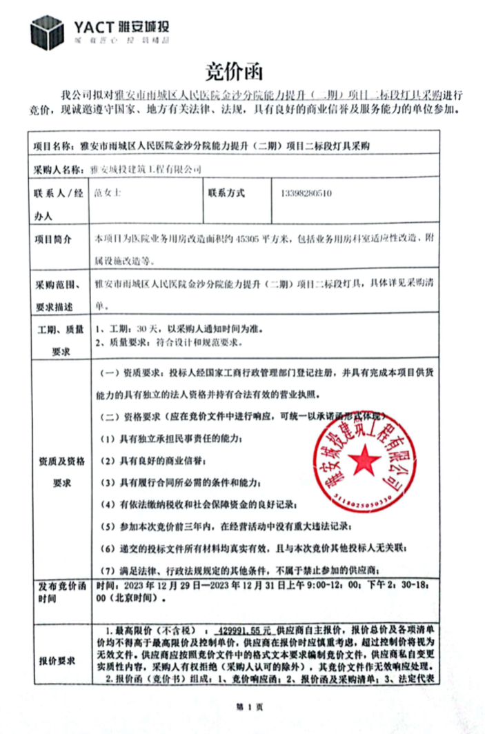 雅安市雨城區(qū)人民醫(yī)院分院能力提升(二期)項(xiàng)目二標(biāo)段燈具采購競價(jià)公告