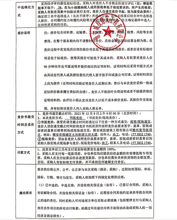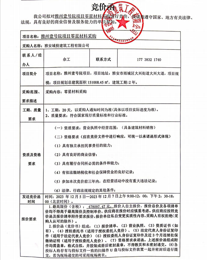 雅州壹號(hào)院項(xiàng)目零星材料采購(gòu)競(jìng)價(jià)公告