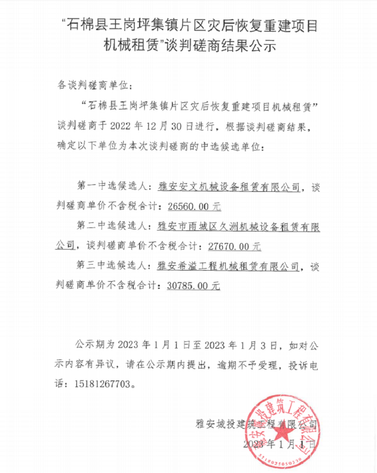 “石棉縣王崗坪集鎮(zhèn)片區(qū)災后恢復重建項目機械租賃”談判磋商結(jié)果公示