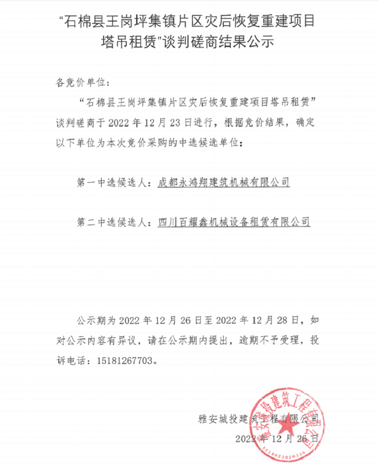 “石棉縣王崗坪集鎮(zhèn)片區(qū)災(zāi)后恢復重建項目塔吊租賃”談判磋商結(jié)果公示