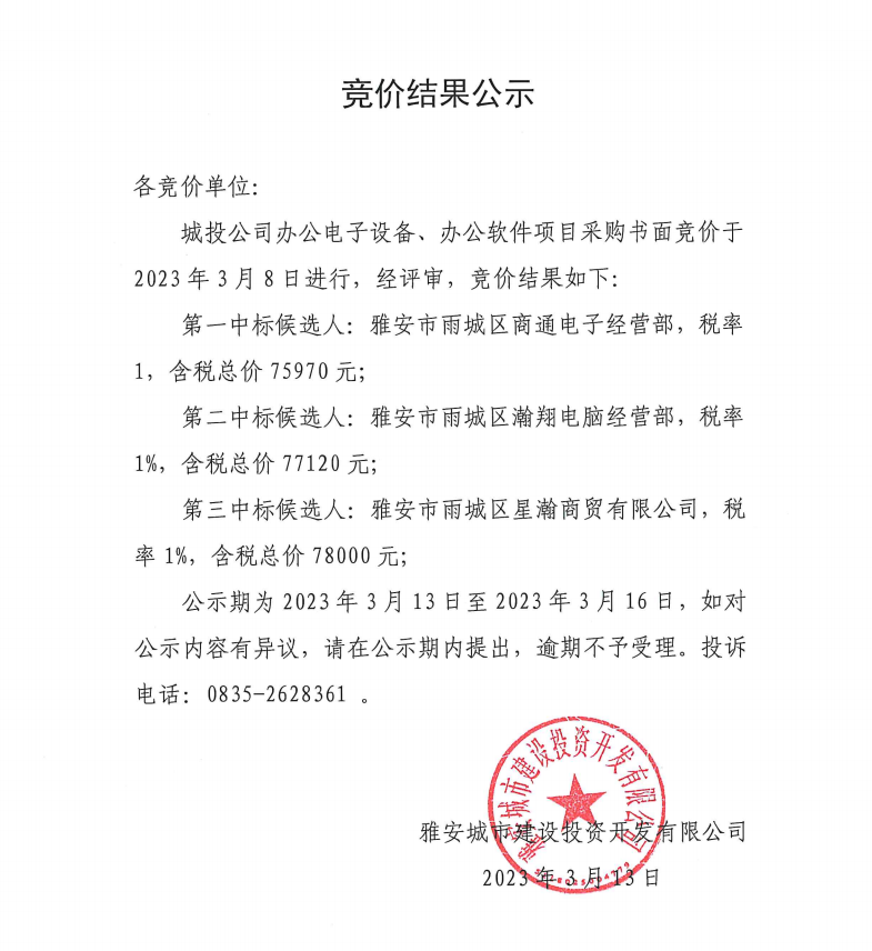 城投公司辦公電子設(shè)備、辦公軟件項(xiàng)目采購競價(jià)結(jié)果公示