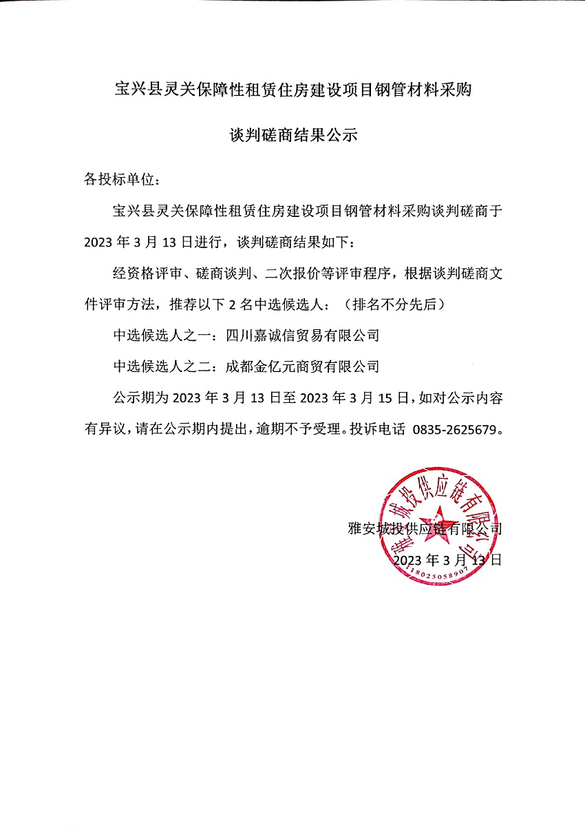 寶興縣靈關(guān)保障性租賃住房建設(shè)項目鋼管材料采購談判磋商結(jié)果公示