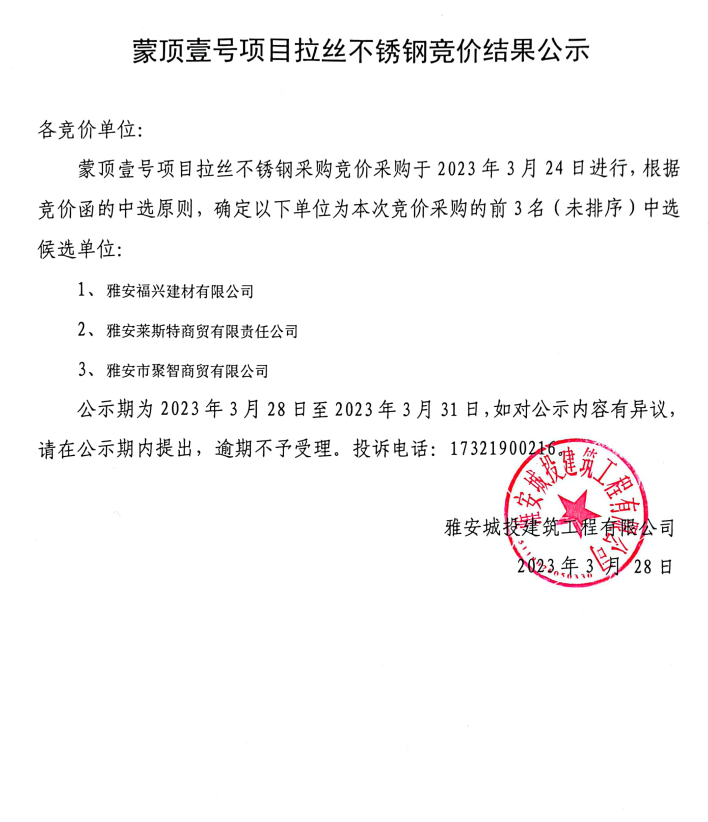 蒙頂壹號項目拉絲不銹鋼競價結(jié)果公示