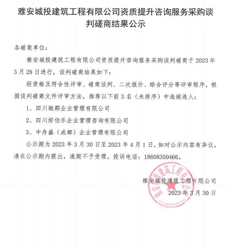 雅安城投建筑工程有限公司資質(zhì)提升咨詢服務采購談判磋商結(jié)果公示
