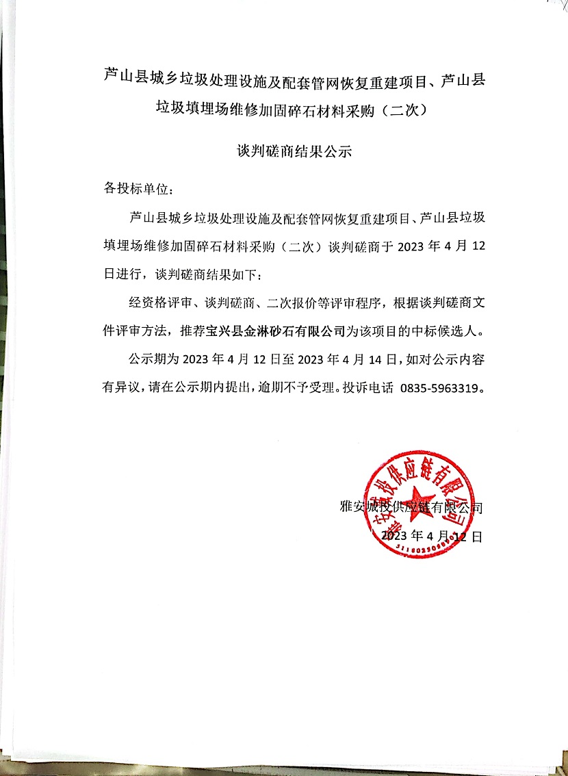 蘆山縣城鄉(xiāng)垃圾處理設(shè)施及配套管網(wǎng)恢復(fù)重建項(xiàng)目、蘆山縣垃圾填埋場(chǎng)維修加固碎石材料采購(gòu)(二次)談判磋商結(jié)果公示