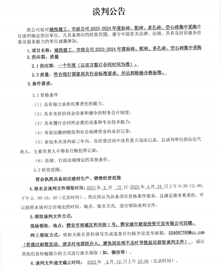 城投建工、市政公司2023-2024年度標磚、配磚、多孔磚、空心磚集中采購談判公告