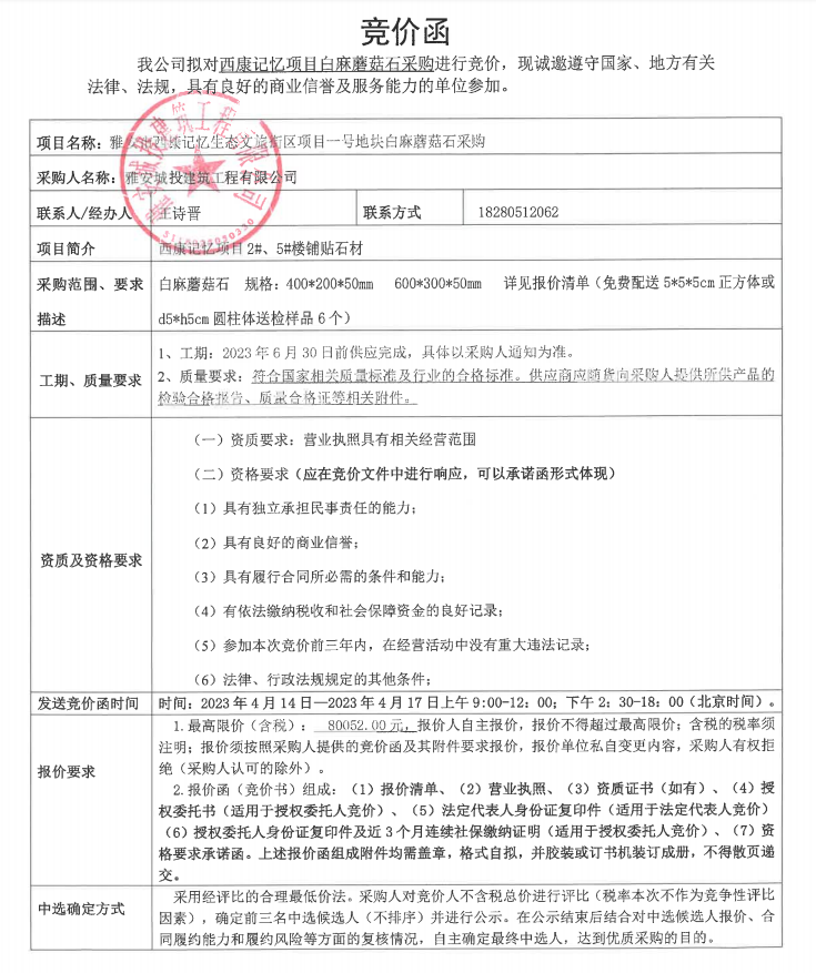 雅安市西康記憶生態(tài)文旅街區(qū)項(xiàng)目一號(hào)地塊白麻蘑菇石競價(jià)采購公告
