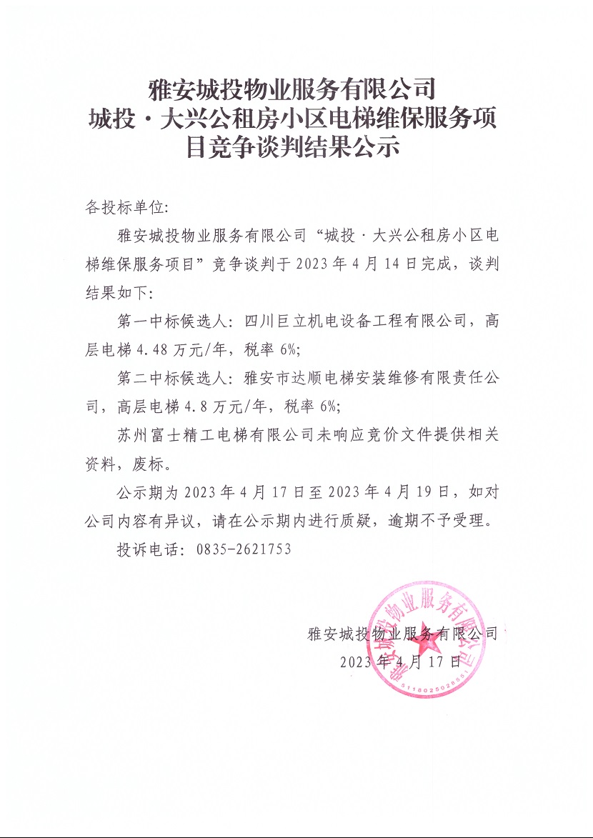 雅安城投物業(yè)有限公司城投·大興公租房小區(qū)電梯維保服務(wù)項(xiàng)目競爭談判結(jié)果公示