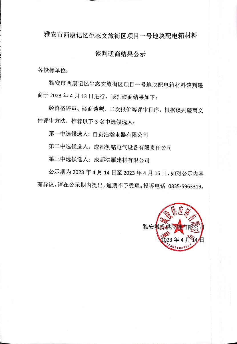 雅安市西康記憶生態(tài)文旅街區(qū)項(xiàng)目一號地塊配電箱材料談判磋商結(jié)果公示