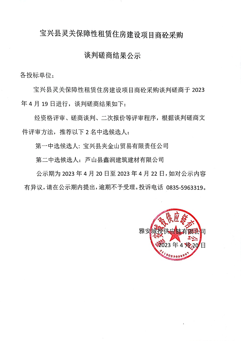 寶興縣靈關保障性租賃住房建設項目商砼采購談判磋商結果公示