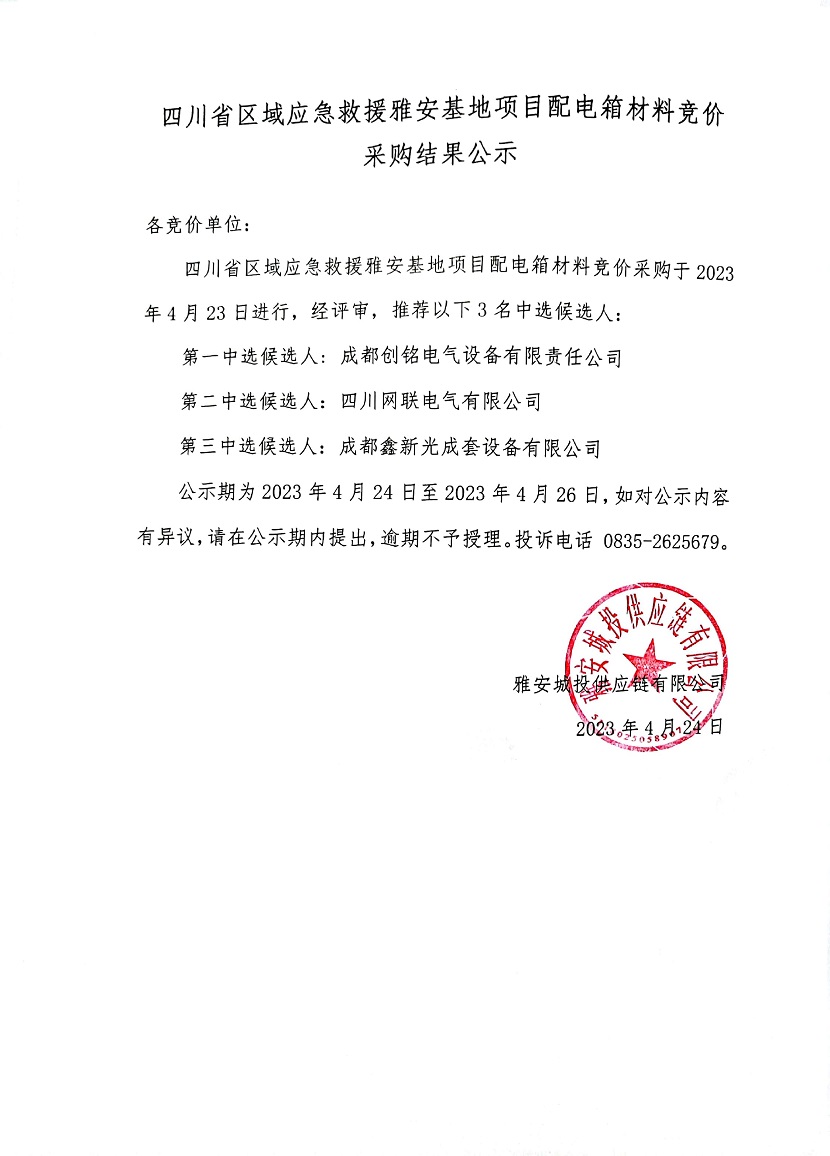 四川省區(qū)域應(yīng)急救援雅安基地項(xiàng)目配電箱材料競(jìng)價(jià)采購結(jié)果公示