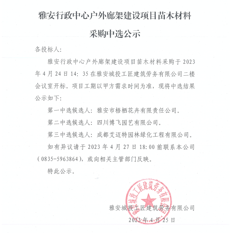 雅安行政中心戶外廊架建設項目苗木材料采購中選公示