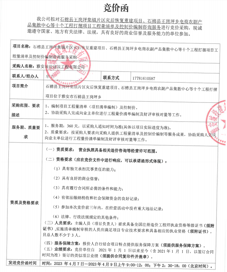 王崗坪集鎮(zhèn)項(xiàng)目、王崗坪集散中心打捆項(xiàng)目工程量清單及控制價(jià)編制咨詢(xún)服務(wù)采購(gòu)競(jìng)價(jià)公告