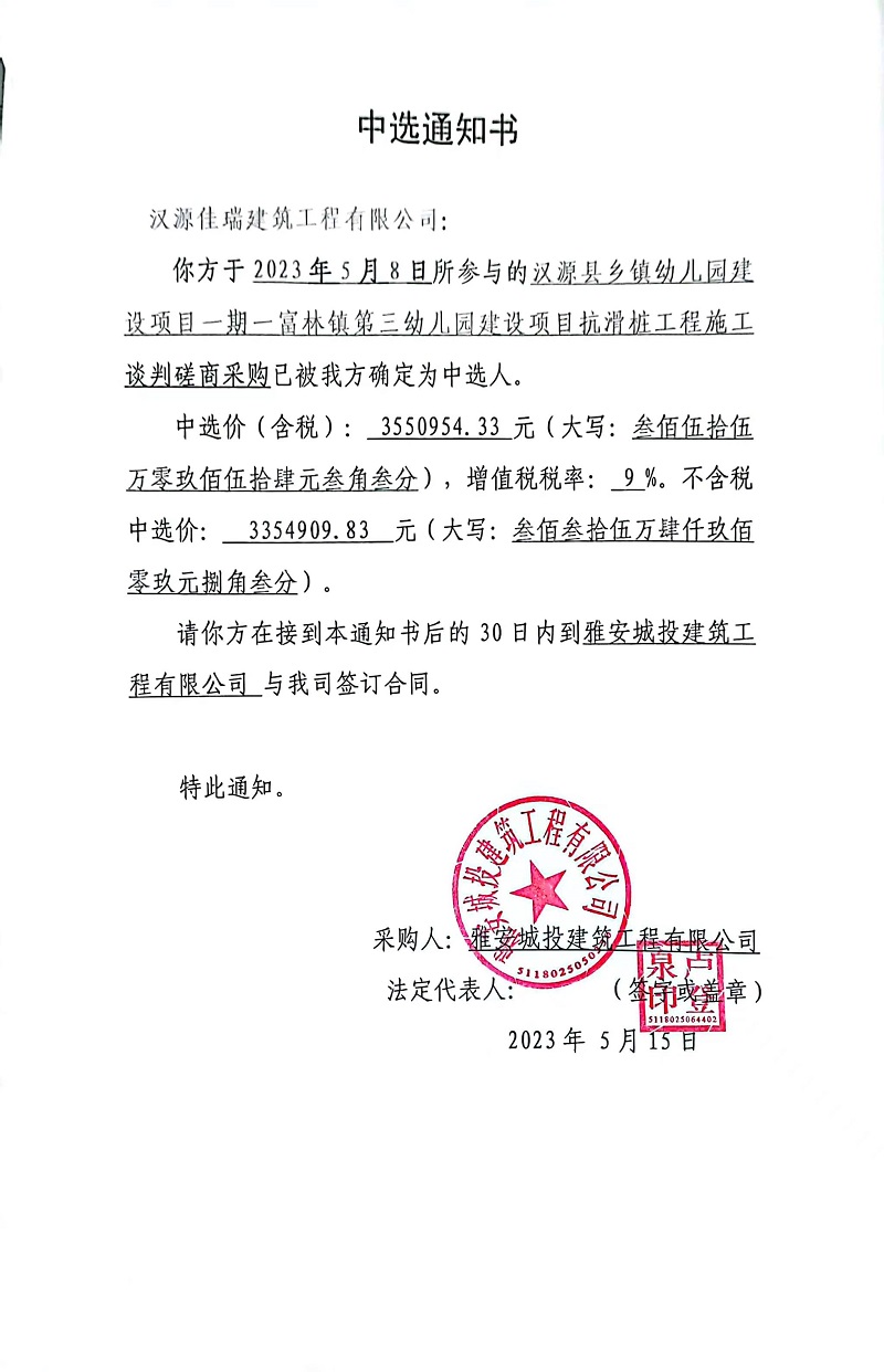 漢源縣鄉(xiāng)鎮(zhèn)幼兒園建設(shè)項目一期一富林鎮(zhèn)第三幼兒園建設(shè)項目抗滑樁工程施工談判磋商采購中選通知書