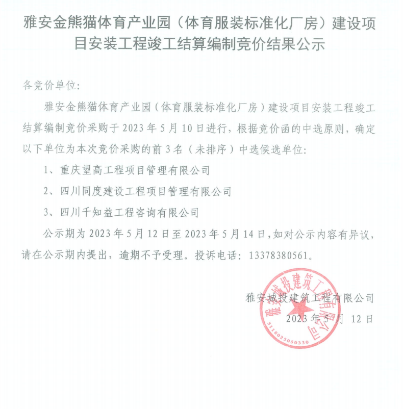 雅安金熊貓體育產(chǎn)業(yè)園(體育服裝標準化廠房)建設項目安裝工程結算編制競價結果公示