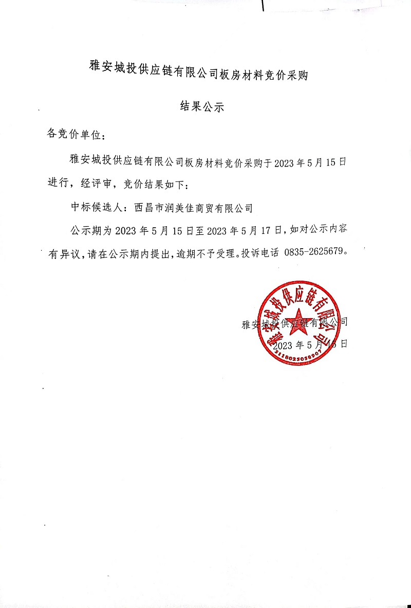 雅安城投供應(yīng)鏈有限公司板房材料競(jìng)價(jià)采購結(jié)果公示