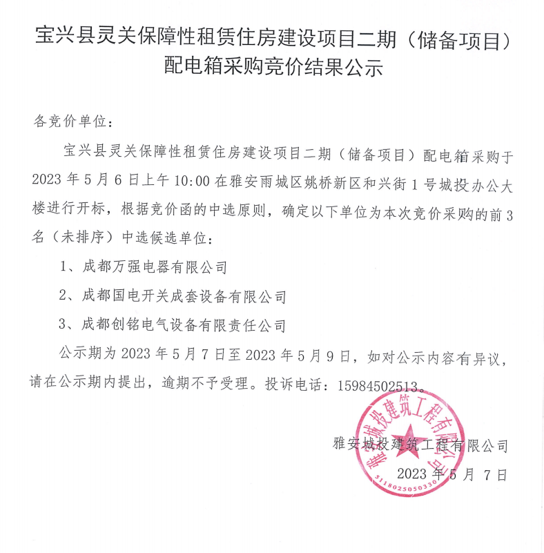 寶興縣靈關保障性租賃住房建設項目二期(儲備項目)配電箱采購競價結果公示
