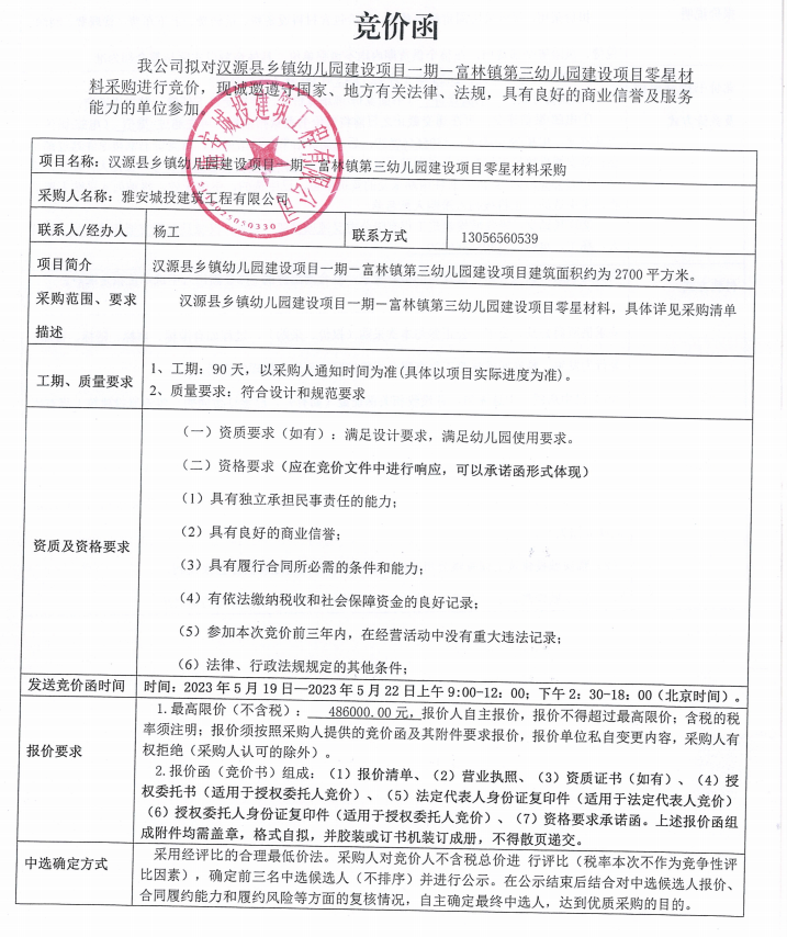 漢源縣鄉(xiāng)鎮(zhèn)幼兒園建設(shè)項(xiàng)目一期一富林鎮(zhèn)第三幼兒園建設(shè)項(xiàng)目零星材料采購競價(jià)公告