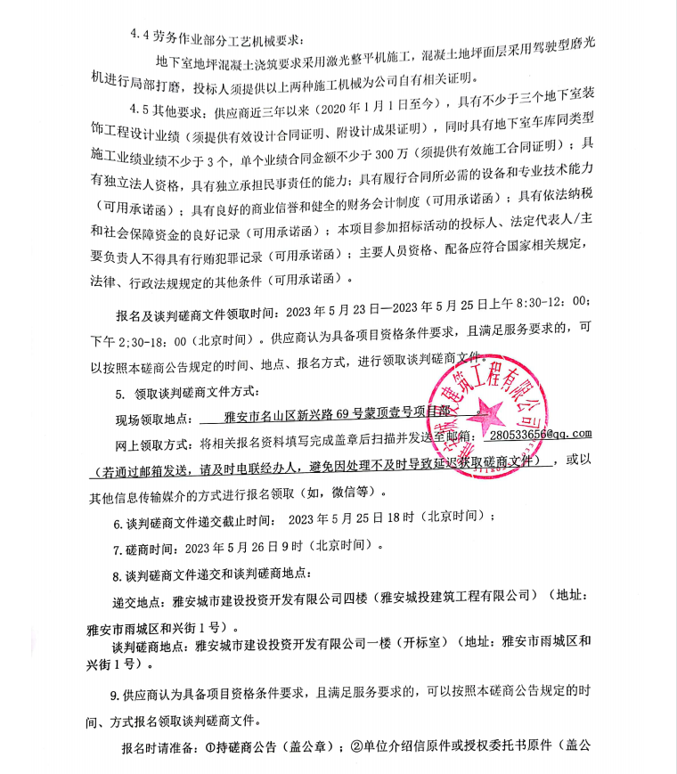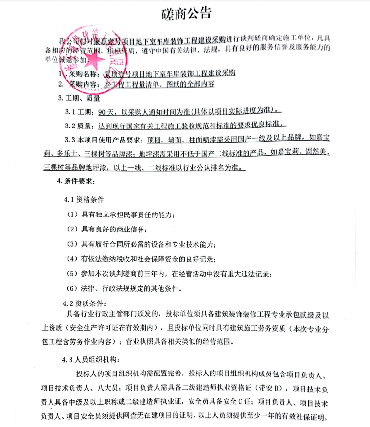 蒙頂壹號(hào)項(xiàng)目地下室車庫(kù)裝飾工程建設(shè)采購(gòu)談判磋商公告