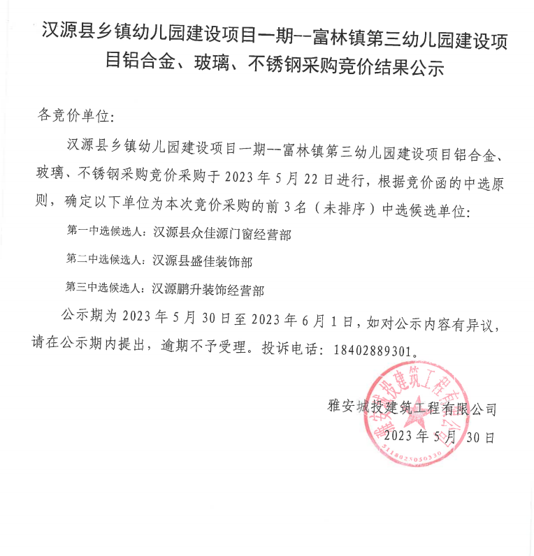 漢源縣鄉(xiāng)鎮(zhèn)幼兒園建設(shè)項(xiàng)目一期--富林鎮(zhèn)第三幼兒園建設(shè)項(xiàng)目鋁合金、玻璃、不銹鋼采購競價結(jié)果公示