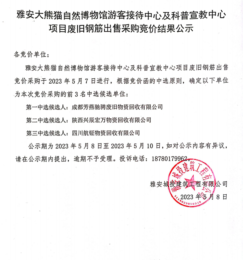 雅安大熊貓自然博物館游客接待中心及科普宣教中心項(xiàng)目廢舊鋼筋出售采購競價結(jié)果公示
