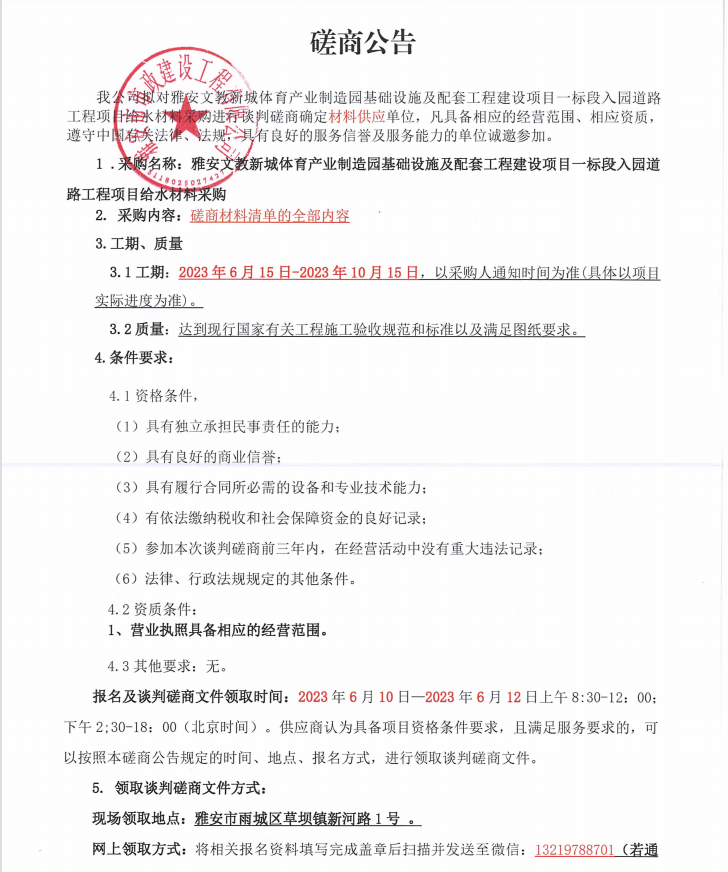 雅安文教新城體育產(chǎn)業(yè)制造園基礎(chǔ)設(shè)施及配套工程建設(shè)項目一標(biāo)段入園道路工程項目給水材料采購談判磋商公告