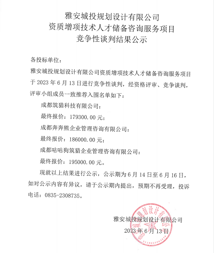 雅安城投規(guī)劃設(shè)計有限公司資質(zhì)增項(xiàng)技術(shù)人才儲備咨詢服務(wù)項(xiàng)目競爭性談判結(jié)果公示
