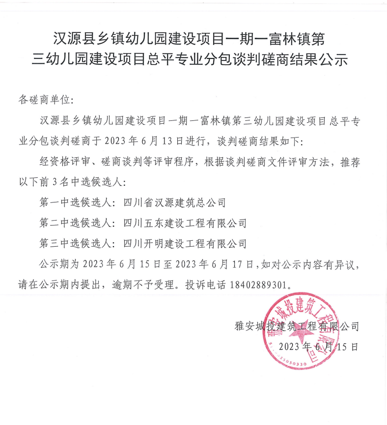 漢源縣鄉(xiāng)鎮(zhèn)幼兒園建設(shè)項(xiàng)目一期--富林鎮(zhèn)第三幼兒園建設(shè)項(xiàng)目總平專業(yè)分包談判磋商結(jié)果公示