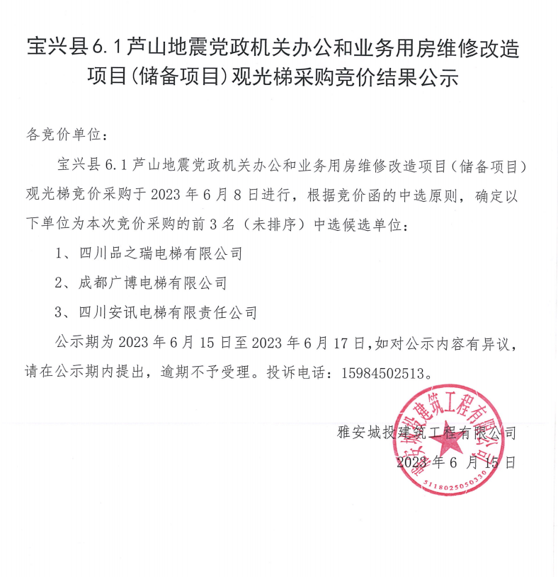寶興縣6.1蘆山地震黨政機關辦公和業(yè)務用房維修改造項目(儲備項目)觀光梯采購競價結果公示