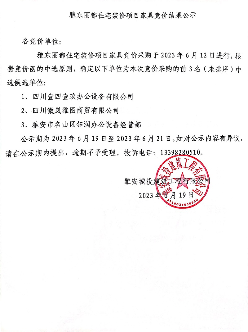 雅東麗都住宅裝修項(xiàng)目家具競(jìng)價(jià)結(jié)果公示