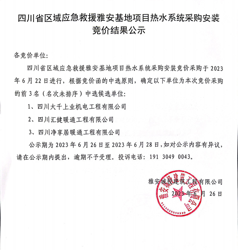 四川省區(qū)域應(yīng)急救援雅安基地項目熱水系統(tǒng)采購安裝競價結(jié)果公示
