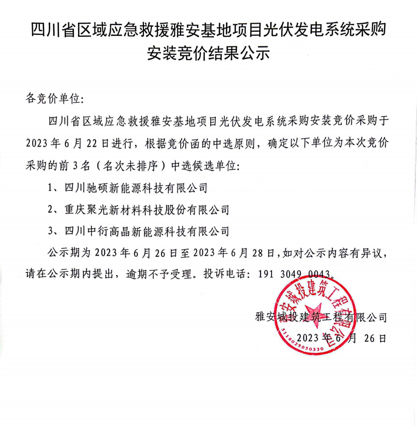 四川省區(qū)域應(yīng)急救援雅安基地項(xiàng)目光伏發(fā)電系統(tǒng)采購(gòu)安裝競(jìng)價(jià)結(jié)果公示
